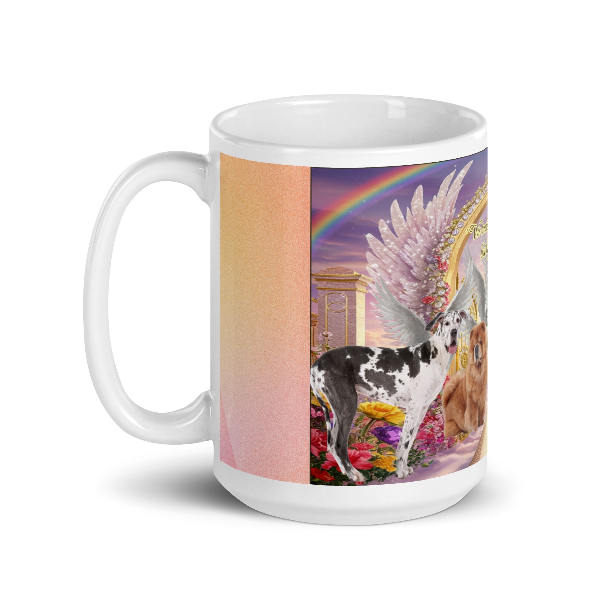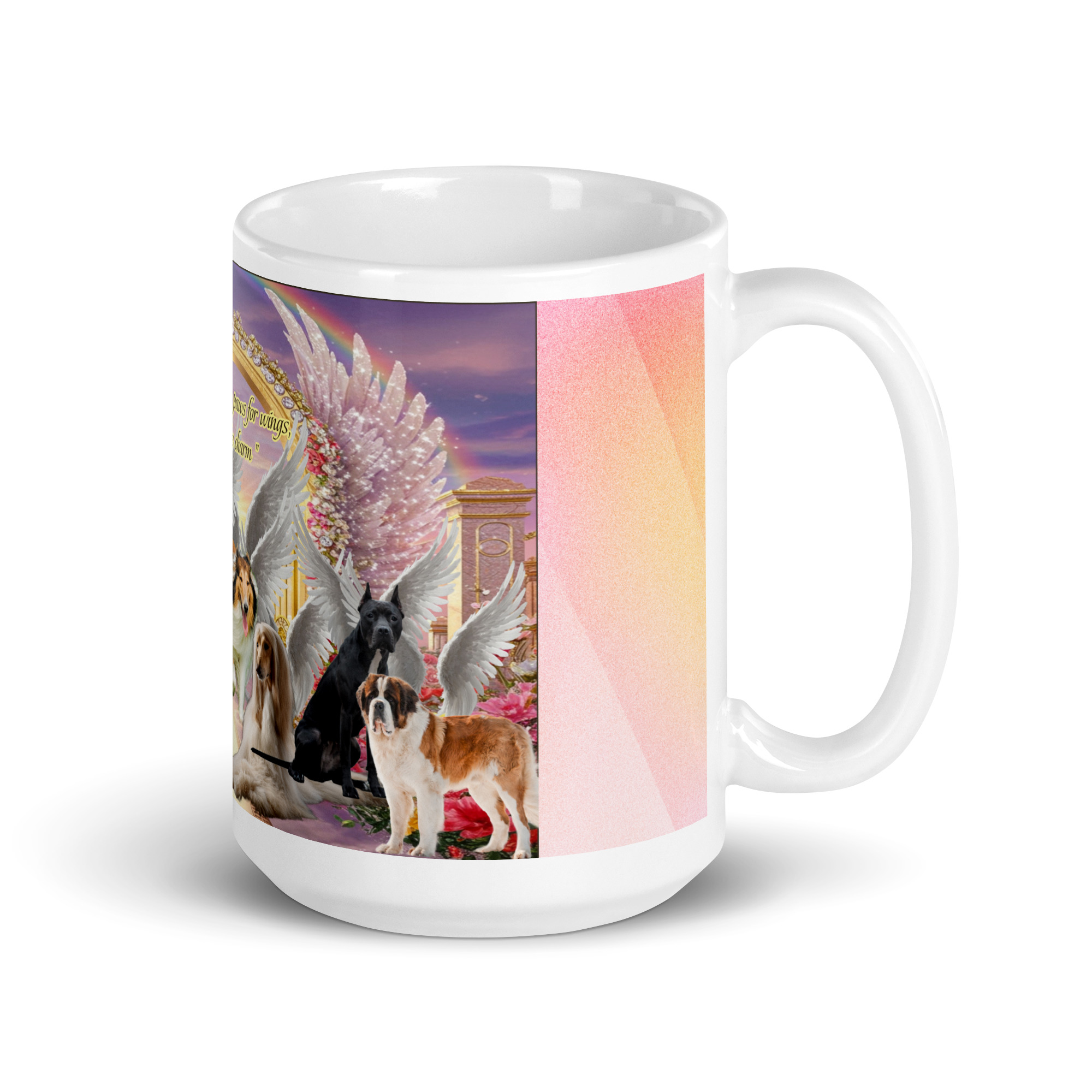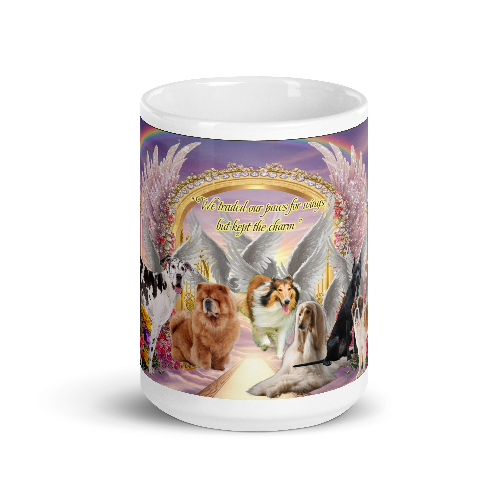 All Breeds in Heaven ” We traded our paws for wings but kept the charm” 15oz. White glossy mug