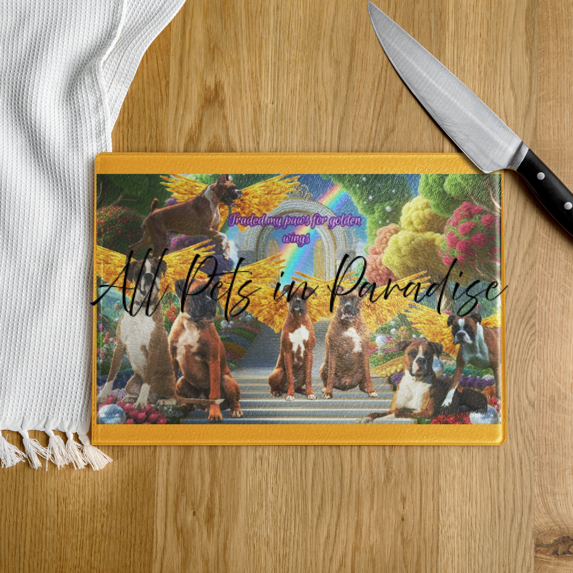 Boxers (Heaven in the Home)- ” Traded my paws for golden wings” 11×15 Glass cutting board