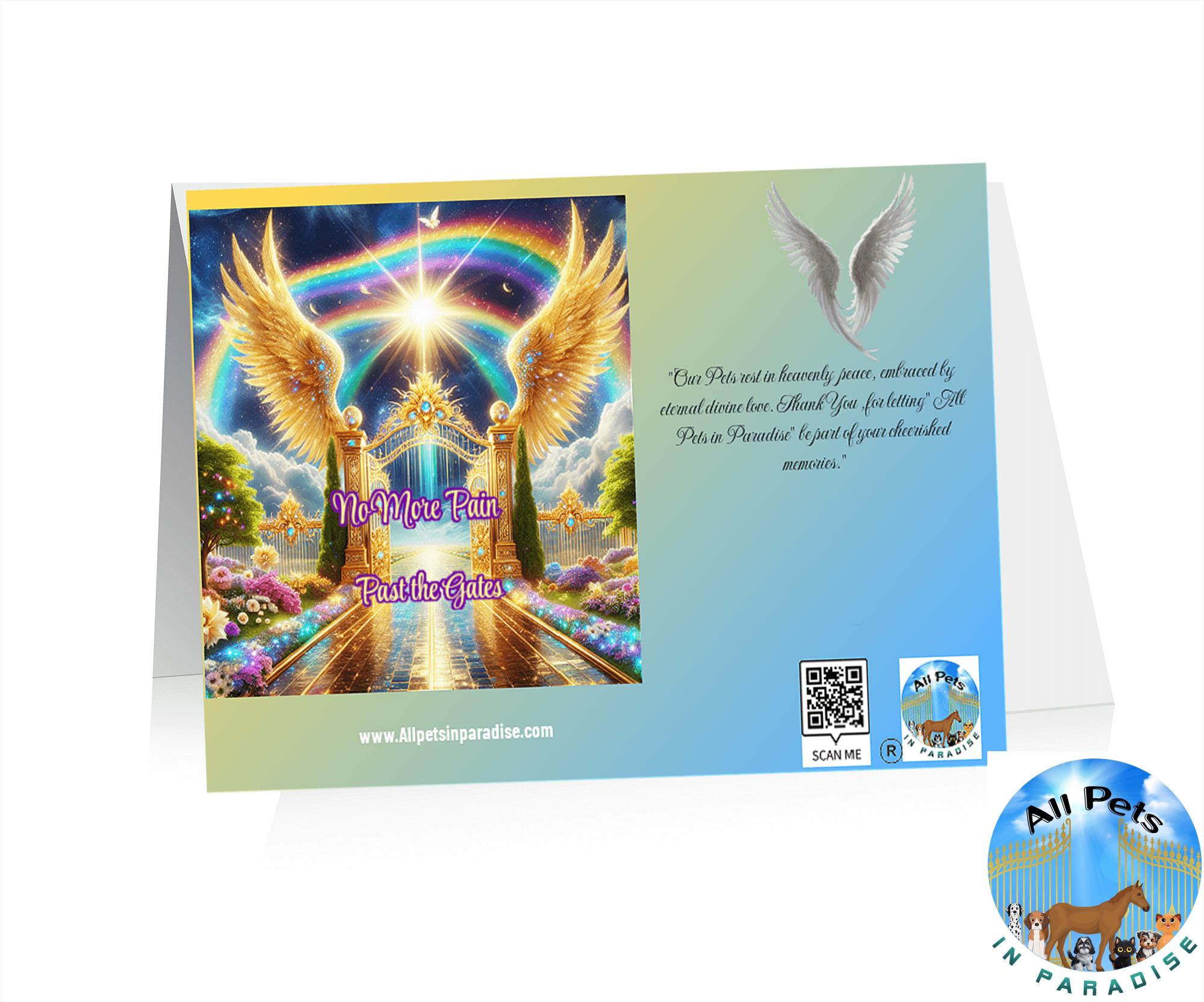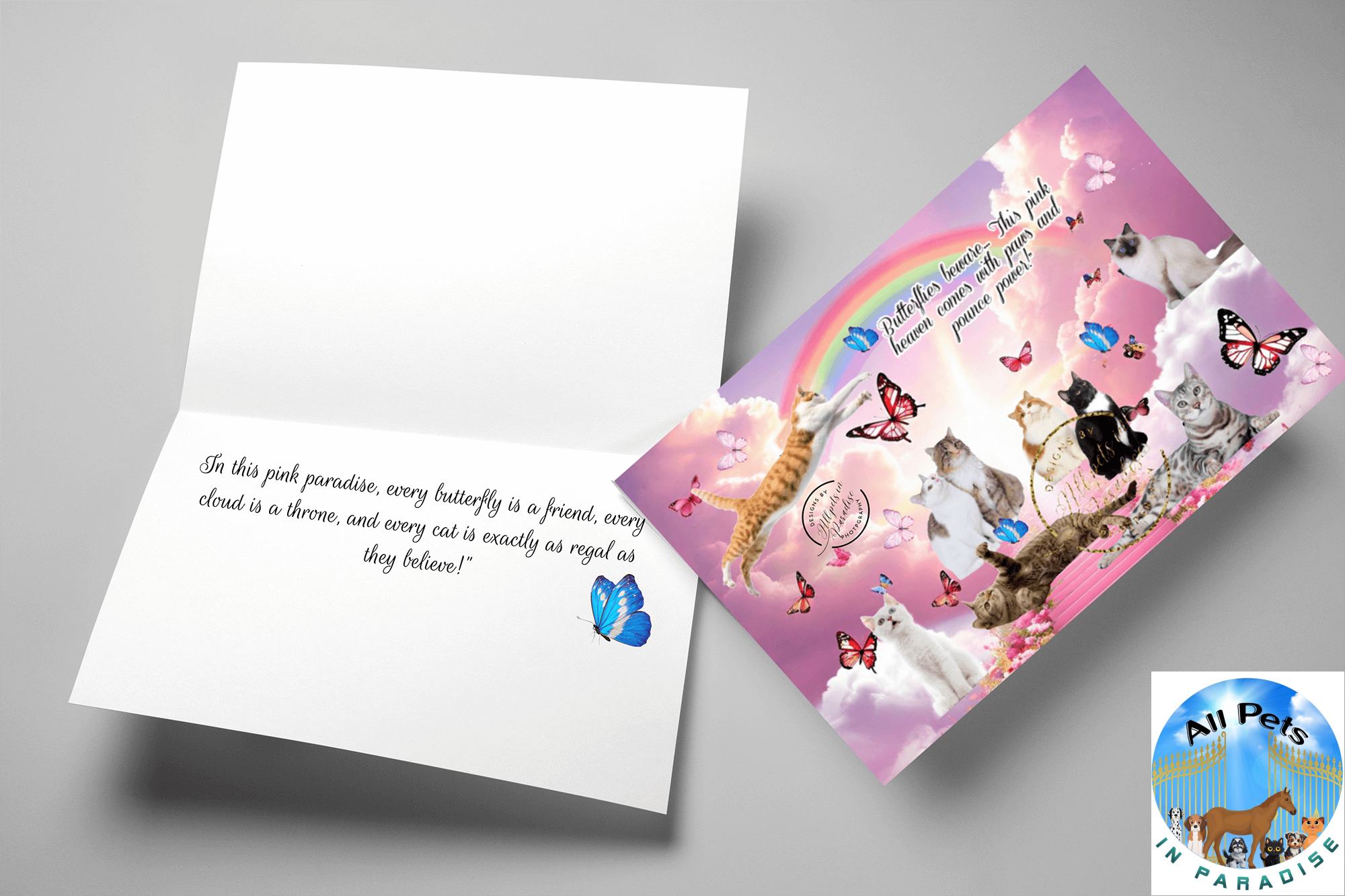 This calming, heartfelt card offers a gentle tribute to the cats who’ve crossed the rainbow bridge — capturing the spiritual sense of peace, beauty, and eternal love. The butterfly, a universal symbol of transformation and the soul, adds a touch of grace to this tender keepsake.