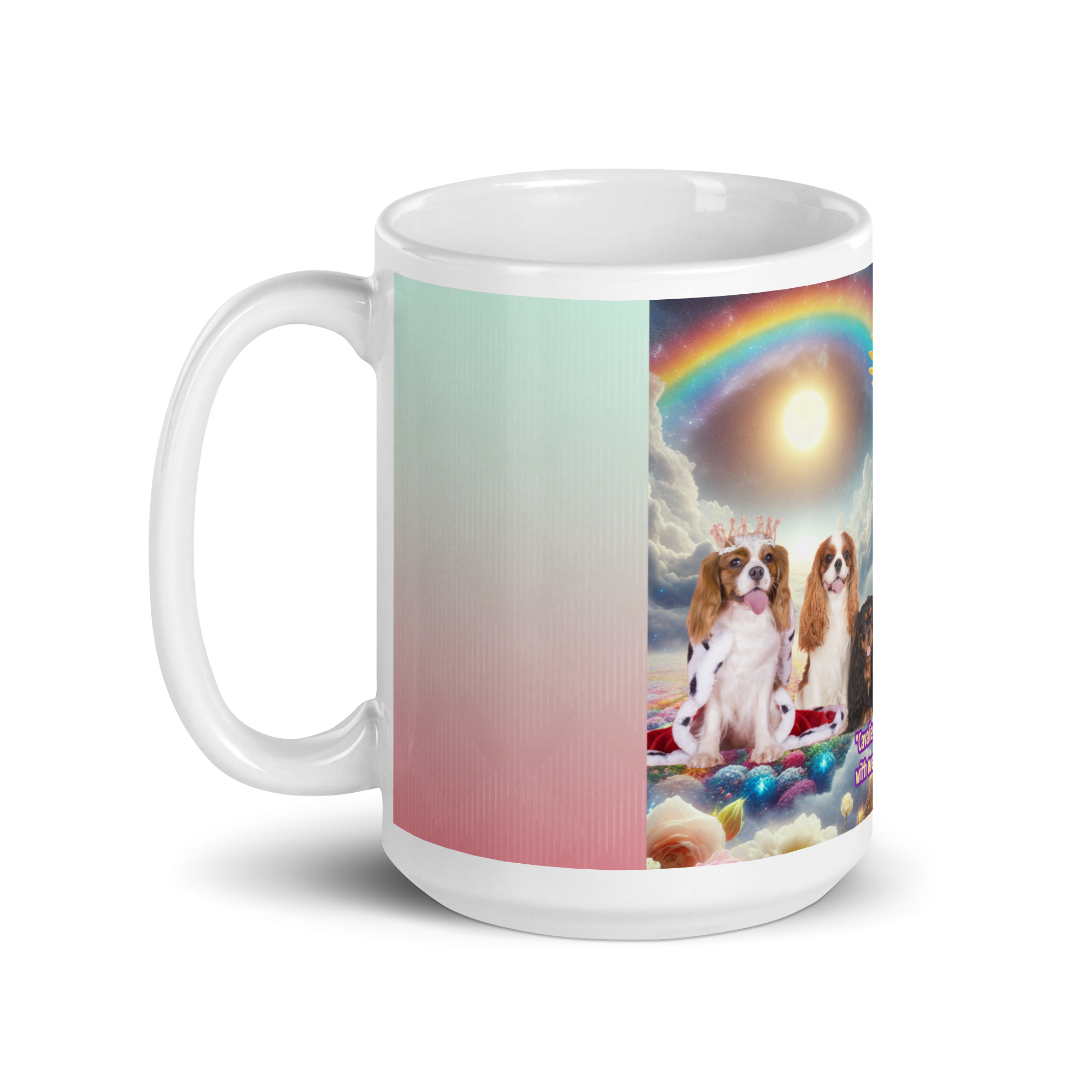 Cavalier King Charles ” Cavalier King Fur-ever golden with overflowing royal treats” 15.oz White glossy mug