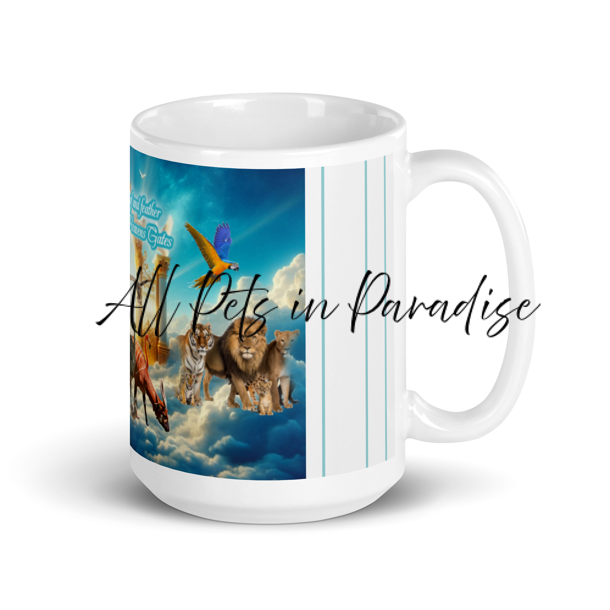 ” Every Paw Hoof and feather finds its way to Heavens Gates” White glossy mug