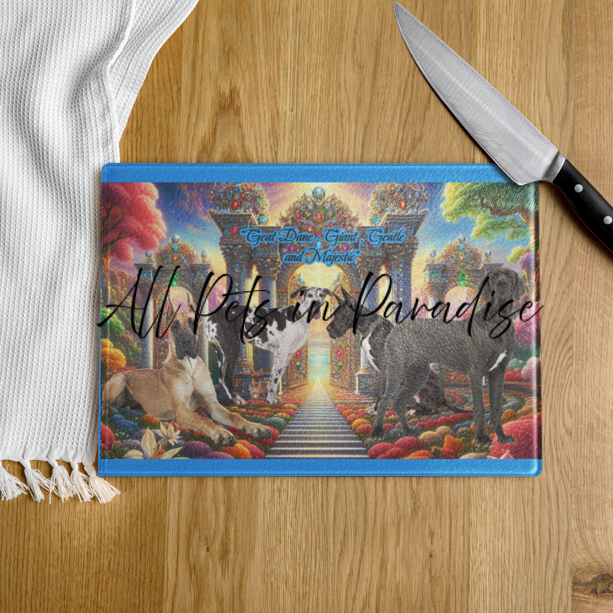 Great Danes in Heaven ” Great Dane : Giant , Gentle and Majestic” 11×15 Glass cutting board