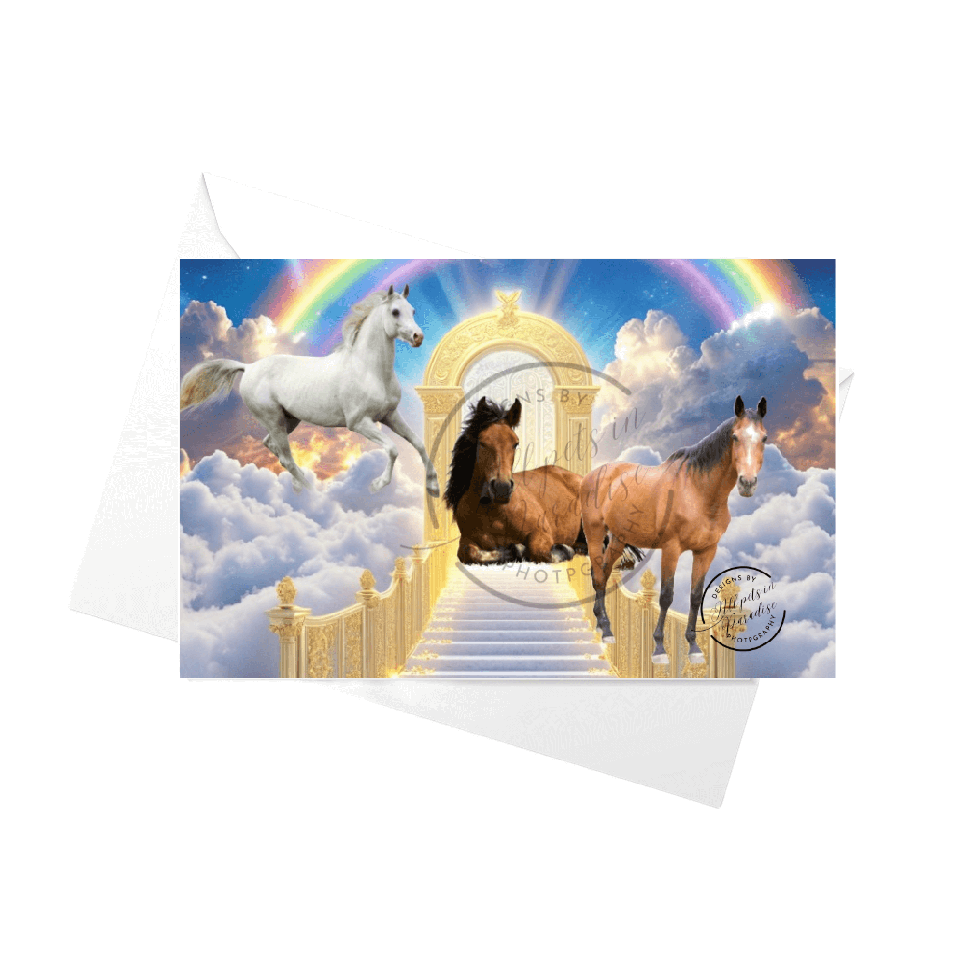 Horses in Paradise honors the deep, unspoken bond between horse and human — a connection built on trust, freedom, and heart. Whether they were a trail companion, show champion, or barnyard best friend, this card offers a graceful way to celebrate their spirit.