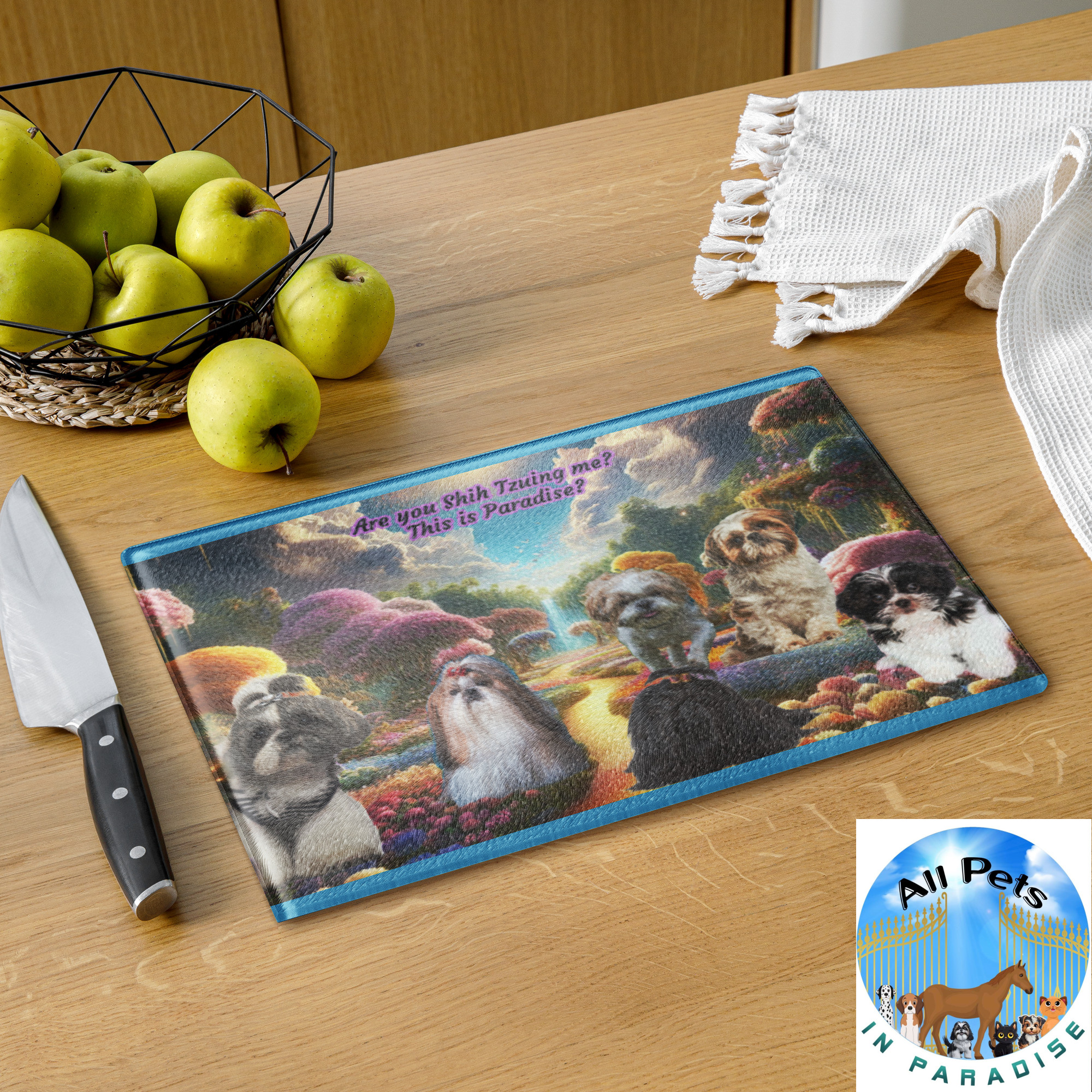 Shih Tzus in Heaven ” Are you Shih Tzuing me? This is Paradise? 11×15 Glass cutting board