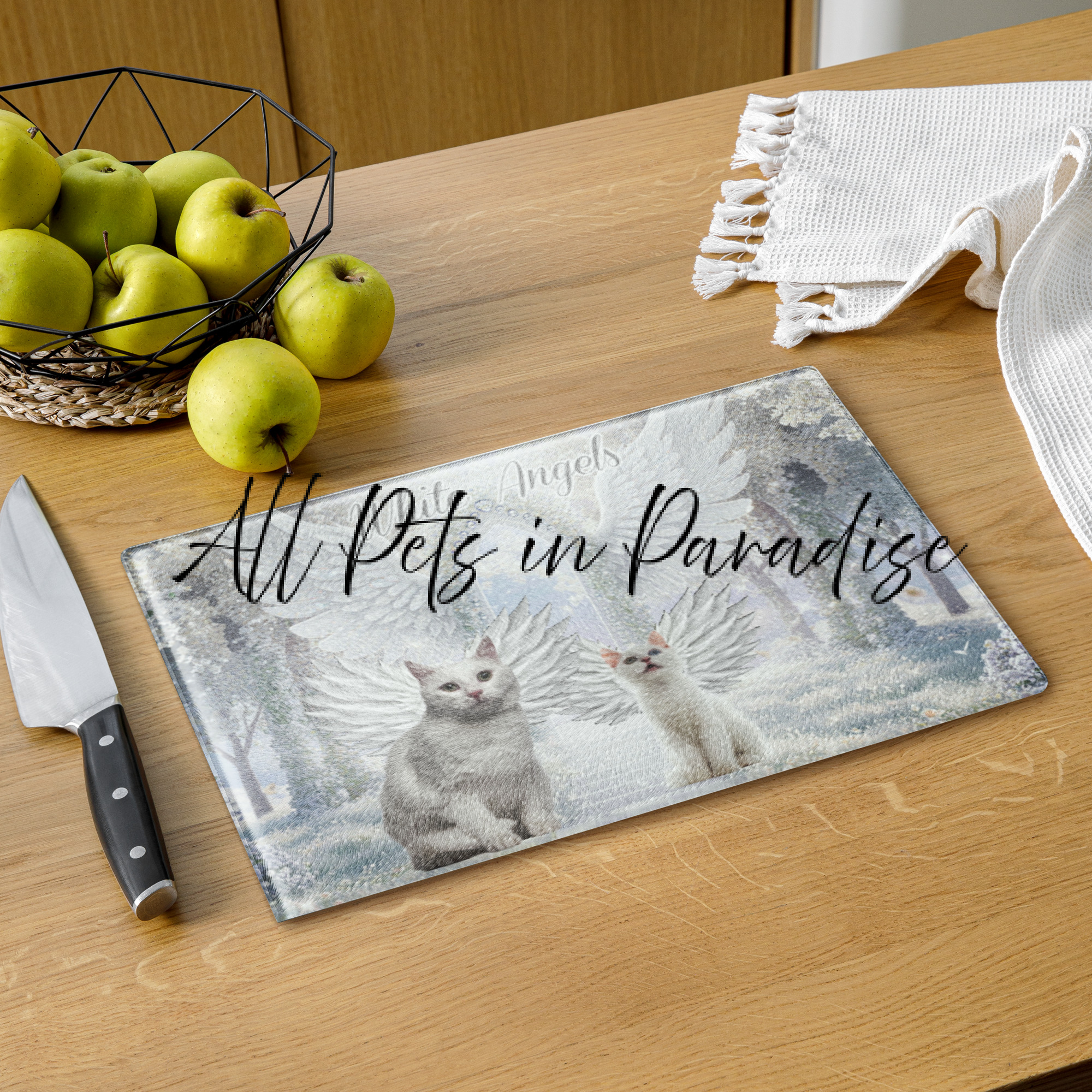 White Cats in Heaven ” White Angels ” 11×15 Glass cutting board