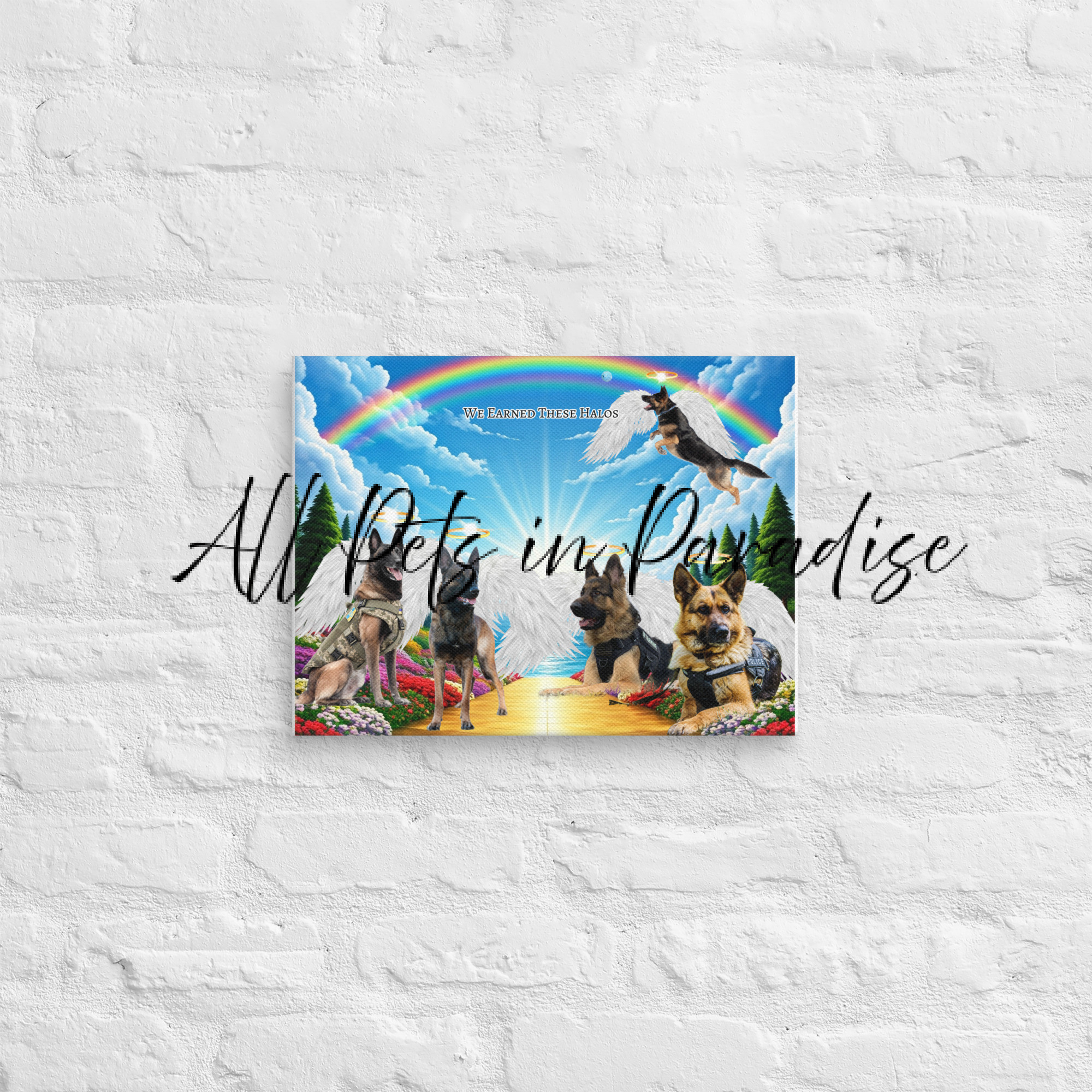German Shepherds (Working Dogs in Heaven) ” We Earned These Halos” 12×16 Canvas